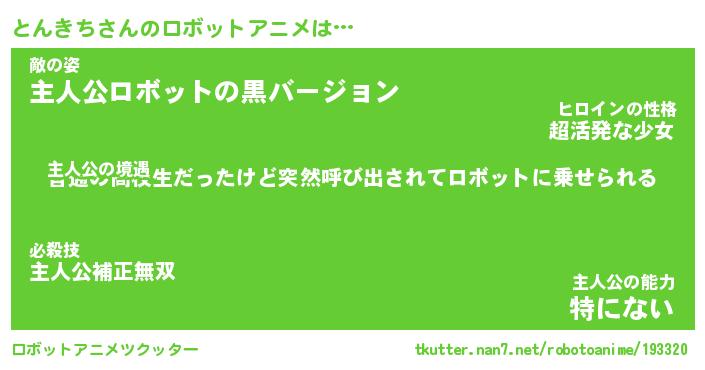 とんきちさんのロボットアニメは… 主人公の境遇『普通の高校生だったけど突然呼び出されてロボットに乗せられる』敵の姿『主人公ロボットの黒バージョン』主人公の能力『特にない』 ツクッター #ロボットアニメツクッター http://tkutter.nan7.net/robotoanime/193320/
