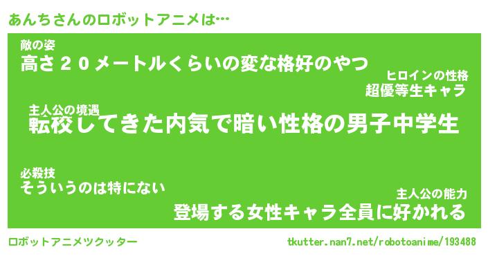 あんちさんのロボットアニメは… 主人公の境遇『転校してきた内気で暗い性格の男子中学生』敵の姿『高さ20メートルくらいの変な格好のやつ』主人公の能力『登場する女性キャラ全員に好かれる』 ツクッター #ロボットアニメツクッター http://tkutter.nan7.net/robotoanime/193488/