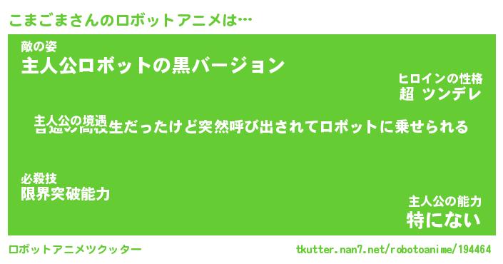 こまごまさんのロボットアニメは… 主人公の境遇『普通の高校生だったけど突然呼び出されてロボットに乗せられる』敵の姿『主人公ロボットの黒バージョン』主人公の能力『特にない』 ツクッター #ロボットアニメツクッター http://tkutter.nan7.net/robotoanime/194464/