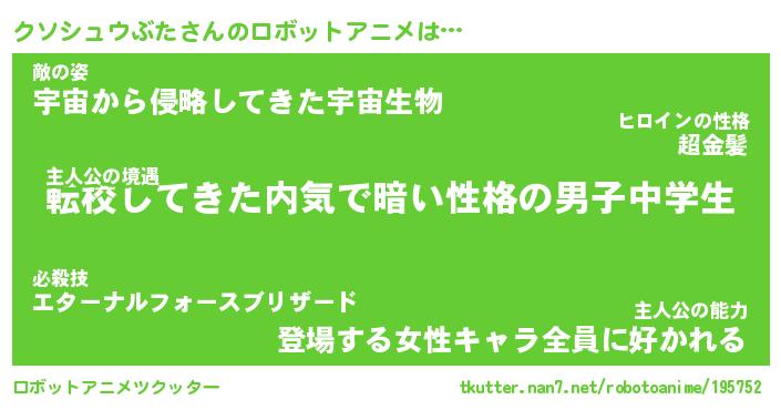 クソシュウぶたさんのロボットアニメは… 主人公の境遇『転校してきた内気で暗い性格の男子中学生』敵の姿『宇宙から侵略してきた宇宙生物』主人公の能力『登場する女性キャラ全員に好かれる』 ツクッター #ロボットアニメツクッター http://tkutter.nan7.net/robotoanime/195752/