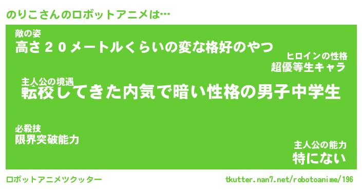 のりこさんのロボットアニメは… 主人公の境遇『転校してきた内気で暗い性格の男子中学生』敵の姿『高さ20メートルくらいの変な格好のやつ』主人公の能力『特にない』 ツクッター #ロボットアニメツクッター http://tkutter.nan7.net/robotoanime/196/