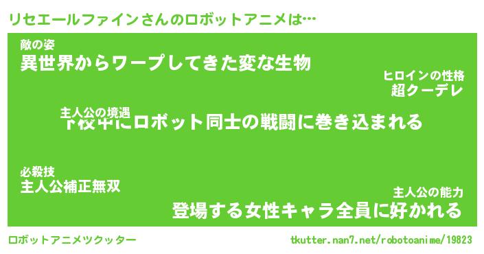 リセエールファインさんのロボットアニメは… 主人公の境遇『下校中にロボット同士の戦闘に巻き込まれる』敵の姿『異世界からワープしてきた変な生物』主人公の能力『登場する女性キャラ全員に好かれる』 ツクッター #ロボットアニメツクッター http://tkutter.nan7.net/robotoanime/19823/
