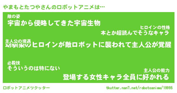 やまもとたつやさんのロボットアニメは… 主人公の境遇『幼馴染のヒロインが敵ロボットに襲われて主人公が覚醒』敵の姿『宇宙から侵略してきた宇宙生物』主人公の能力『登場する女性キャラ全員に好かれる』 ツクッター #ロボットアニメツクッター http://tkutter.nan7.net/robotoanime/19995/