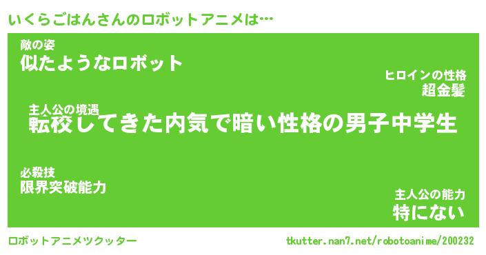 いくらごはんさんのロボットアニメは… 主人公の境遇『転校してきた内気で暗い性格の男子中学生』敵の姿『似たようなロボット』主人公の能力『特にない』 ツクッター #ロボットアニメツクッター http://tkutter.nan7.net/robotoanime/200232/
