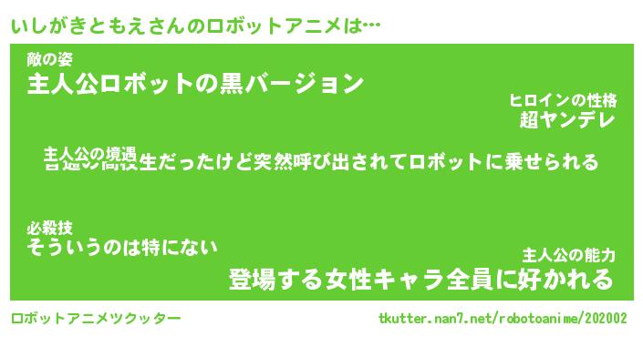 いしがきともえさんのロボットアニメは… 主人公の境遇『普通の高校生だったけど突然呼び出されてロボットに乗せられる』敵の姿『主人公ロボットの黒バージョン』主人公の能力『登場する女性キャラ全員に好かれる』 ツクッター #ロボットアニメツクッター http://tkutter.nan7.net/robotoanime/202002/