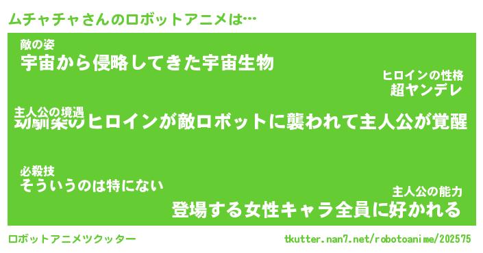ムチャチャさんのロボットアニメは… 主人公の境遇『幼馴染のヒロインが敵ロボットに襲われて主人公が覚醒』敵の姿『宇宙から侵略してきた宇宙生物』主人公の能力『登場する女性キャラ全員に好かれる』 ツクッター #ロボットアニメツクッター http://tkutter.nan7.net/robotoanime/202575/