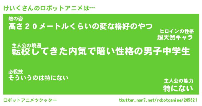 けいくさんのロボットアニメは… 主人公の境遇『転校してきた内気で暗い性格の男子中学生』敵の姿『高さ20メートルくらいの変な格好のやつ』主人公の能力『特にない』 ツクッター #ロボットアニメツクッター http://tkutter.nan7.net/robotoanime/205821/