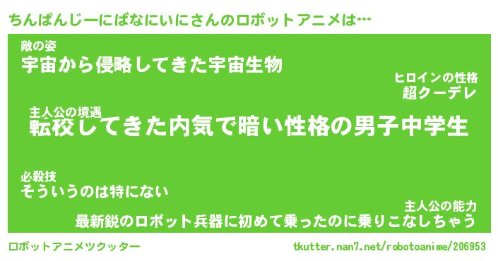 ちんぱんじーにばなにいにさんのロボットアニメは… 主人公の境遇『転校してきた内気で暗い性格の男子中学生』敵の姿『宇宙から侵略してきた宇宙生物』主人公の能力『最新鋭のロボット兵器に初めて乗ったのに乗りこなしちゃう』 ツクッター #ロボットアニメツクッター http://tkutter.nan7.net/robotoanime/206953/