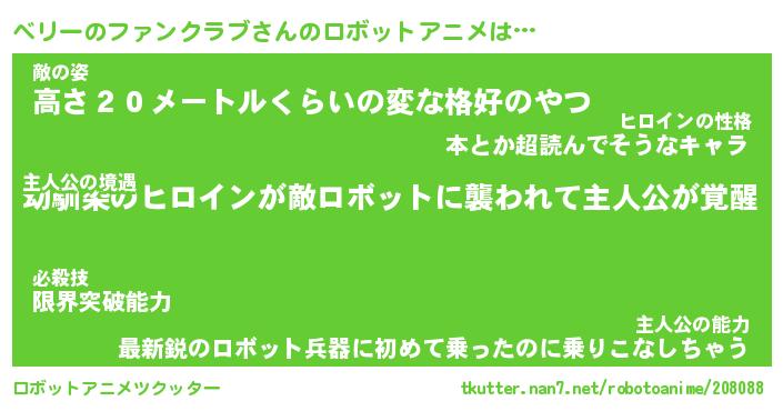 ベリーのファンクラブさんのロボットアニメは… 主人公の境遇『幼馴染のヒロインが敵ロボットに襲われて主人公が覚醒』敵の姿『高さ20メートルくらいの変な格好のやつ』主人公の能力『最新鋭のロボット兵器に初めて乗ったのに乗りこなしちゃう』 ツクッター #ロボットアニメツクッター http://tkutter.nan7.net/robotoanime/208088/