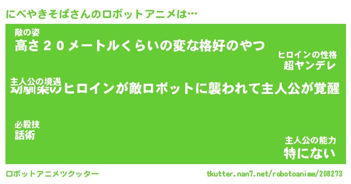 にべやきそばさんのロボットアニメは… 主人公の境遇『幼馴染のヒロインが敵ロボットに襲われて主人公が覚醒』敵の姿『高さ20メートルくらいの変な格好のやつ』主人公の能力『特にない』 ツクッター #ロボットアニメツクッター http://tkutter.nan7.net/robotoanime/208273/