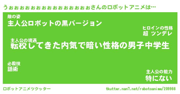 うぉぉぉぉぉぉぉぉぉぉぉぉぉぉぉさんのロボットアニメは… 主人公の境遇『転校してきた内気で暗い性格の男子中学生』敵の姿『主人公ロボットの黒バージョン』主人公の能力『特にない』 ツクッター #ロボットアニメツクッター http://tkutter.nan7.net/robotoanime/209966/