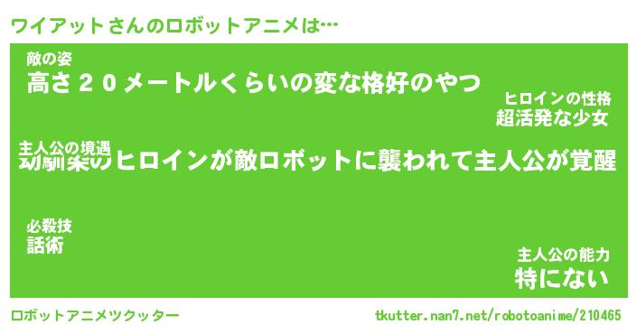 ワイアットさんのロボットアニメは… 主人公の境遇『幼馴染のヒロインが敵ロボットに襲われて主人公が覚醒』敵の姿『高さ20メートルくらいの変な格好のやつ』主人公の能力『特にない』 ツクッター #ロボットアニメツクッター http://tkutter.nan7.net/robotoanime/210465/
