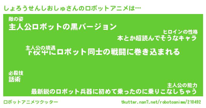 しょろうせんしおしゅさんのロボットアニメは… 主人公の境遇『下校中にロボット同士の戦闘に巻き込まれる』敵の姿『主人公ロボットの黒バージョン』主人公の能力『最新鋭のロボット兵器に初めて乗ったのに乗りこなしちゃう』 ツクッター #ロボットアニメツクッター http://tkutter.nan7.net/robotoanime/210492/