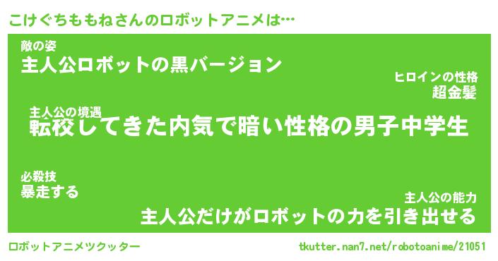 こけぐちももねさんのロボットアニメは… 主人公の境遇『転校してきた内気で暗い性格の男子中学生』敵の姿『主人公ロボットの黒バージョン』主人公の能力『主人公だけがロボットの力を引き出せる』 ツクッター #ロボットアニメツクッター http://tkutter.nan7.net/robotoanime/21051/