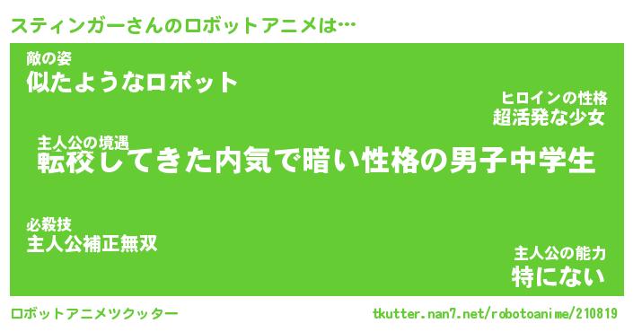 スティンガーさんのロボットアニメは… 主人公の境遇『転校してきた内気で暗い性格の男子中学生』敵の姿『似たようなロボット』主人公の能力『特にない』 ツクッター #ロボットアニメツクッター http://tkutter.nan7.net/robotoanime/210819/