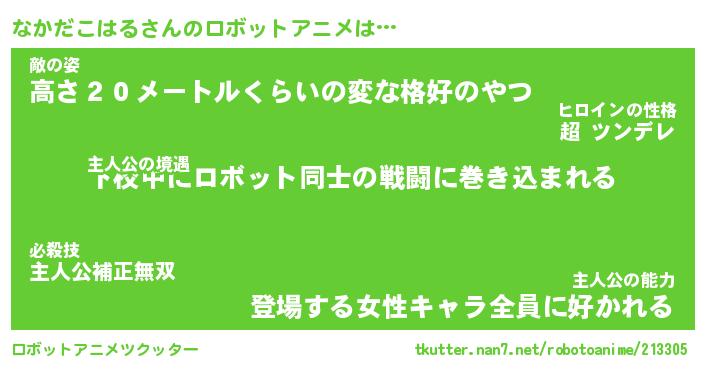 なかだこはるさんのロボットアニメは… 主人公の境遇『下校中にロボット同士の戦闘に巻き込まれる』敵の姿『高さ20メートルくらいの変な格好のやつ』主人公の能力『登場する女性キャラ全員に好かれる』 ツクッター #ロボットアニメツクッター http://tkutter.nan7.net/robotoanime/213305/