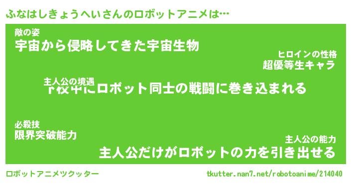 ふなはしきょうへいさんのロボットアニメは… 主人公の境遇『下校中にロボット同士の戦闘に巻き込まれる』敵の姿『宇宙から侵略してきた宇宙生物』主人公の能力『主人公だけがロボットの力を引き出せる』 ツクッター #ロボットアニメツクッター http://tkutter.nan7.net/robotoanime/214040/