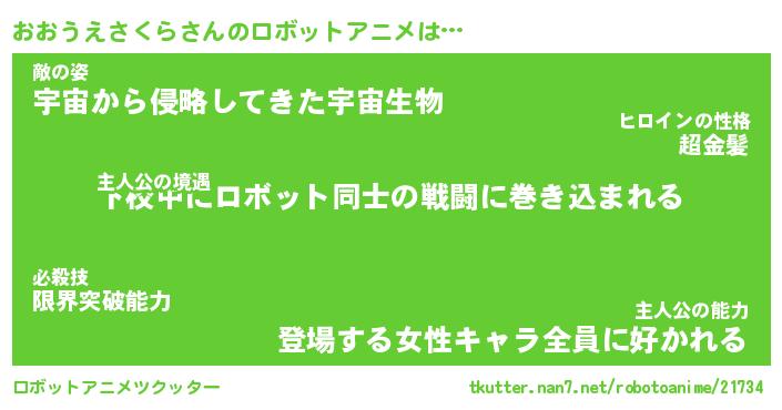 おおうえさくらさんのロボットアニメは… 主人公の境遇『下校中にロボット同士の戦闘に巻き込まれる』敵の姿『宇宙から侵略してきた宇宙生物』主人公の能力『登場する女性キャラ全員に好かれる』 ツクッター #ロボットアニメツクッター http://tkutter.nan7.net/robotoanime/21734/