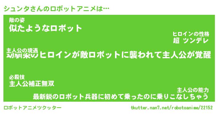 シュンタさんのロボットアニメは… 主人公の境遇『幼馴染のヒロインが敵ロボットに襲われて主人公が覚醒』敵の姿『似たようなロボット』主人公の能力『最新鋭のロボット兵器に初めて乗ったのに乗りこなしちゃう』 ツクッター #ロボットアニメツクッター http://tkutter.nan7.net/robotoanime/22152/