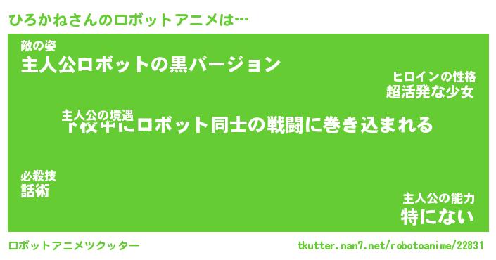 ひろかねさんのロボットアニメは… 主人公の境遇『下校中にロボット同士の戦闘に巻き込まれる』敵の姿『主人公ロボットの黒バージョン』主人公の能力『特にない』 ツクッター #ロボットアニメツクッター http://tkutter.nan7.net/robotoanime/22831/
