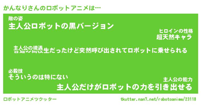 かんなりさんのロボットアニメは… 主人公の境遇『普通の高校生だったけど突然呼び出されてロボットに乗せられる』敵の姿『主人公ロボットの黒バージョン』主人公の能力『主人公だけがロボットの力を引き出せる』 ツクッター #ロボットアニメツクッター http://tkutter.nan7.net/robotoanime/23118/