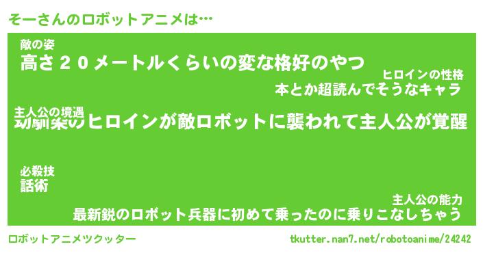そーさんのロボットアニメは… 主人公の境遇『幼馴染のヒロインが敵ロボットに襲われて主人公が覚醒』敵の姿『高さ20メートルくらいの変な格好のやつ』主人公の能力『最新鋭のロボット兵器に初めて乗ったのに乗りこなしちゃう』 ツクッター #ロボットアニメツクッター http://tkutter.nan7.net/robotoanime/24242/