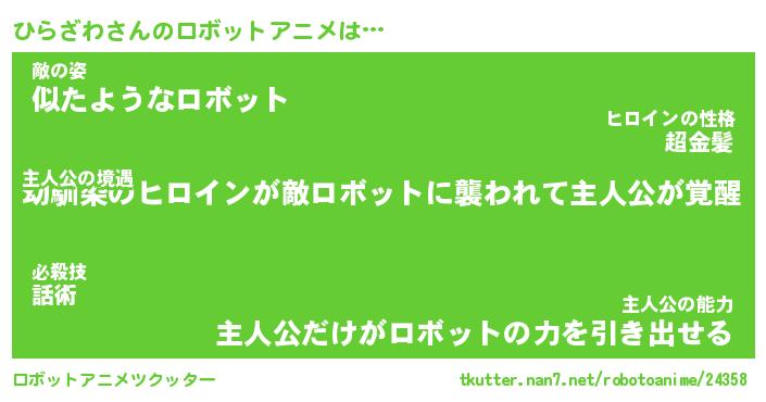 ひらざわさんのロボットアニメは… 主人公の境遇『幼馴染のヒロインが敵ロボットに襲われて主人公が覚醒』敵の姿『似たようなロボット』主人公の能力『主人公だけがロボットの力を引き出せる』 ツクッター #ロボットアニメツクッター http://tkutter.nan7.net/robotoanime/24358/