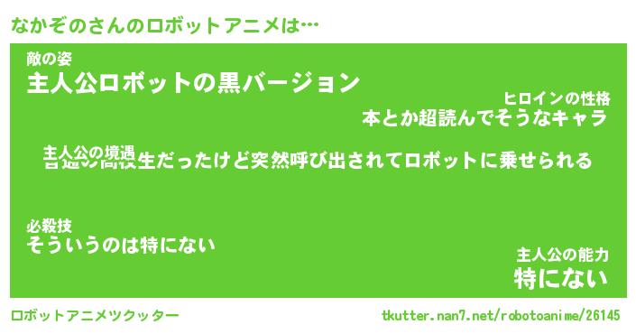 なかぞのさんのロボットアニメは… 主人公の境遇『普通の高校生だったけど突然呼び出されてロボットに乗せられる』敵の姿『主人公ロボットの黒バージョン』主人公の能力『特にない』 ツクッター #ロボットアニメツクッター http://tkutter.nan7.net/robotoanime/26145/