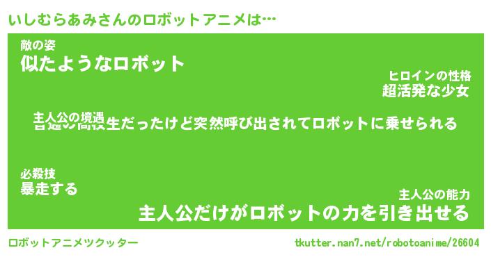 いしむらあみさんのロボットアニメは… 主人公の境遇『普通の高校生だったけど突然呼び出されてロボットに乗せられる』敵の姿『似たようなロボット』主人公の能力『主人公だけがロボットの力を引き出せる』 ツクッター #ロボットアニメツクッター http://tkutter.nan7.net/robotoanime/26604/