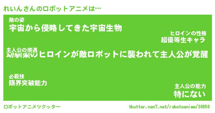 れいんさんのロボットアニメは… 主人公の境遇『幼馴染のヒロインが敵ロボットに襲われて主人公が覚醒』敵の姿『宇宙から侵略してきた宇宙生物』主人公の能力『特にない』 ツクッター #ロボットアニメツクッター http://tkutter.nan7.net/robotoanime/30950/