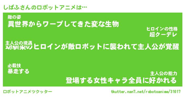 しばふさんのロボットアニメは… 主人公の境遇『幼馴染のヒロインが敵ロボットに襲われて主人公が覚醒』敵の姿『異世界からワープしてきた変な生物』主人公の能力『登場する女性キャラ全員に好かれる』 ツクッター #ロボットアニメツクッター http://tkutter.nan7.net/robotoanime/31017/
