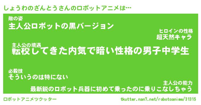 しょうわのざんとうさんのロボットアニメは… 主人公の境遇『転校してきた内気で暗い性格の男子中学生』敵の姿『主人公ロボットの黒バージョン』主人公の能力『最新鋭のロボット兵器に初めて乗ったのに乗りこなしちゃう』 ツクッター #ロボットアニメツクッター http://tkutter.nan7.net/robotoanime/31315/