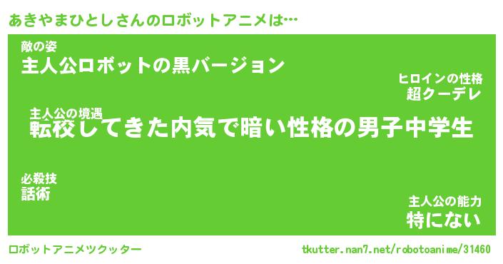 あきやまひとしさんのロボットアニメは… 主人公の境遇『転校してきた内気で暗い性格の男子中学生』敵の姿『主人公ロボットの黒バージョン』主人公の能力『特にない』 ツクッター #ロボットアニメツクッター http://tkutter.nan7.net/robotoanime/31460/