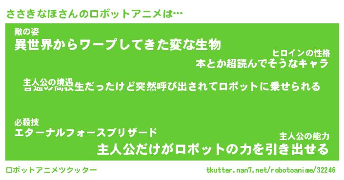 ささきなほさんのロボットアニメは… 主人公の境遇『普通の高校生だったけど突然呼び出されてロボットに乗せられる』敵の姿『異世界からワープしてきた変な生物』主人公の能力『主人公だけがロボットの力を引き出せる』 ツクッター #ロボットアニメツクッター http://tkutter.nan7.net/robotoanime/32246/