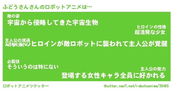 ふどうさんさんのロボットアニメは… 主人公の境遇『幼馴染のヒロインが敵ロボットに襲われて主人公が覚醒』敵の姿『宇宙から侵略してきた宇宙生物』主人公の能力『登場する女性キャラ全員に好かれる』 ツクッター #ロボットアニメツクッター http://tkutter.nan7.net/robotoanime/35455/