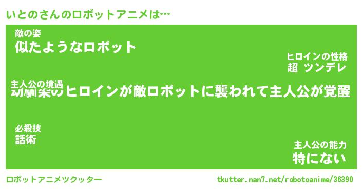 いとのさんのロボットアニメは… 主人公の境遇『幼馴染のヒロインが敵ロボットに襲われて主人公が覚醒』敵の姿『似たようなロボット』主人公の能力『特にない』 ツクッター #ロボットアニメツクッター http://tkutter.nan7.net/robotoanime/36390/