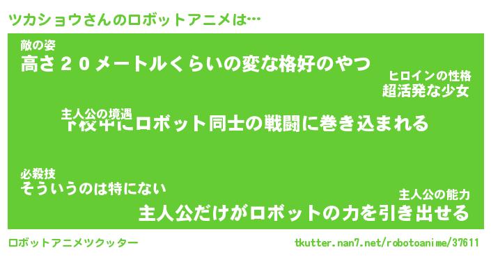 ツカショウさんのロボットアニメは… 主人公の境遇『下校中にロボット同士の戦闘に巻き込まれる』敵の姿『高さ20メートルくらいの変な格好のやつ』主人公の能力『主人公だけがロボットの力を引き出せる』 ツクッター #ロボットアニメツクッター http://tkutter.nan7.net/robotoanime/37611/