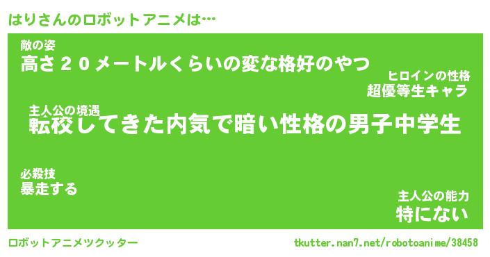 はりさんのロボットアニメは… 主人公の境遇『転校してきた内気で暗い性格の男子中学生』敵の姿『高さ20メートルくらいの変な格好のやつ』主人公の能力『特にない』 ツクッター #ロボットアニメツクッター http://tkutter.nan7.net/robotoanime/38458/
