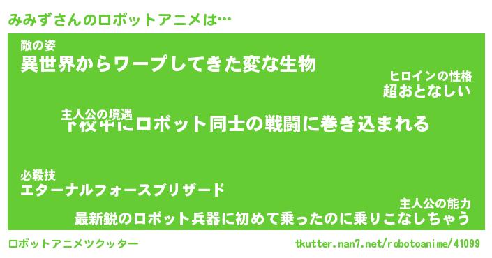 みみずさんのロボットアニメは… 主人公の境遇『下校中にロボット同士の戦闘に巻き込まれる』敵の姿『異世界からワープしてきた変な生物』主人公の能力『最新鋭のロボット兵器に初めて乗ったのに乗りこなしちゃう』 ツクッター #ロボットアニメツクッター http://tkutter.nan7.net/robotoanime/41099/