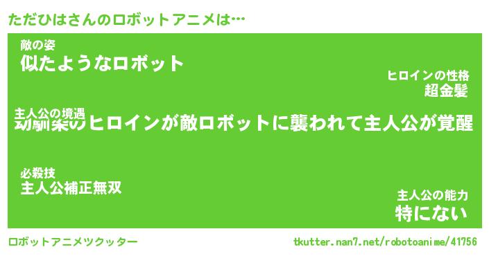 ただひはさんのロボットアニメは… 主人公の境遇『幼馴染のヒロインが敵ロボットに襲われて主人公が覚醒』敵の姿『似たようなロボット』主人公の能力『特にない』 ツクッター #ロボットアニメツクッター http://tkutter.nan7.net/robotoanime/41756/