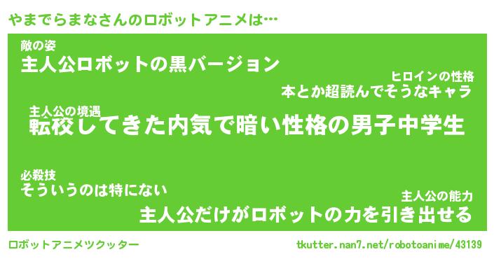 やまでらまなさんのロボットアニメは… 主人公の境遇『転校してきた内気で暗い性格の男子中学生』敵の姿『主人公ロボットの黒バージョン』主人公の能力『主人公だけがロボットの力を引き出せる』 ツクッター #ロボットアニメツクッター http://tkutter.nan7.net/robotoanime/43139/