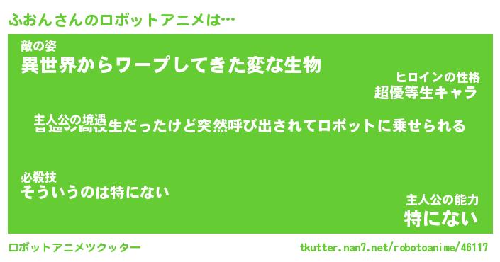 ふおんさんのロボットアニメは… 主人公の境遇『普通の高校生だったけど突然呼び出されてロボットに乗せられる』敵の姿『異世界からワープしてきた変な生物』主人公の能力『特にない』 ツクッター #ロボットアニメツクッター http://tkutter.nan7.net/robotoanime/46117/