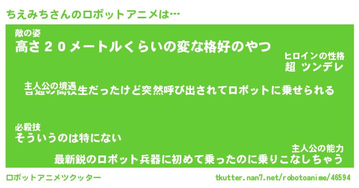 ちえみちさんのロボットアニメは… 主人公の境遇『普通の高校生だったけど突然呼び出されてロボットに乗せられる』敵の姿『高さ20メートルくらいの変な格好のやつ』主人公の能力『最新鋭のロボット兵器に初めて乗ったのに乗りこなしちゃう』 ツクッター #ロボットアニメツクッター http://tkutter.nan7.net/robotoanime/46594/