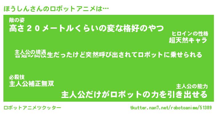 ほうしんさんのロボットアニメは… 主人公の境遇『普通の高校生だったけど突然呼び出されてロボットに乗せられる』敵の姿『高さ20メートルくらいの変な格好のやつ』主人公の能力『主人公だけがロボットの力を引き出せる』 ツクッター #ロボットアニメツクッター http://tkutter.nan7.net/robotoanime/51389/