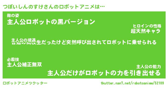 つぼいしんのすけさんのロボットアニメは… 主人公の境遇『普通の高校生だったけど突然呼び出されてロボットに乗せられる』敵の姿『主人公ロボットの黒バージョン』主人公の能力『主人公だけがロボットの力を引き出せる』 ツクッター #ロボットアニメツクッター http://tkutter.nan7.net/robotoanime/52109/