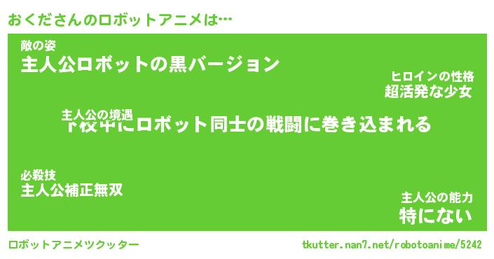 おくださんのロボットアニメは… 主人公の境遇『下校中にロボット同士の戦闘に巻き込まれる』敵の姿『主人公ロボットの黒バージョン』主人公の能力『特にない』 ツクッター #ロボットアニメツクッター http://tkutter.nan7.net/robotoanime/5242/