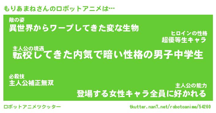 もりあまねさんのロボットアニメは… 主人公の境遇『転校してきた内気で暗い性格の男子中学生』敵の姿『異世界からワープしてきた変な生物』主人公の能力『登場する女性キャラ全員に好かれる』 ツクッター #ロボットアニメツクッター http://tkutter.nan7.net/robotoanime/54260/