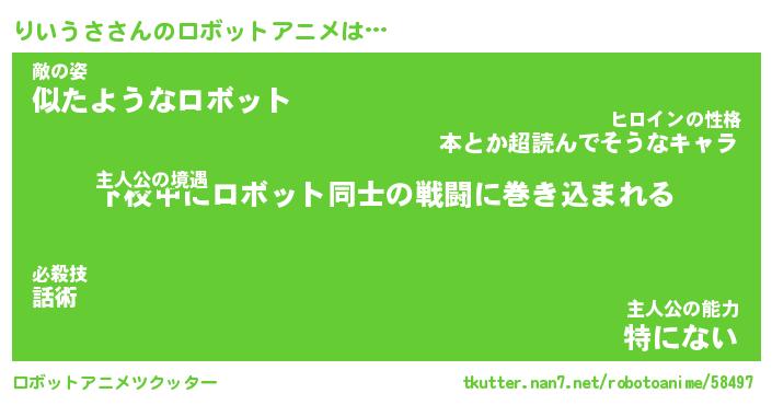 りいうささんのロボットアニメは… 主人公の境遇『下校中にロボット同士の戦闘に巻き込まれる』敵の姿『似たようなロボット』主人公の能力『特にない』 ツクッター #ロボットアニメツクッター http://tkutter.nan7.net/robotoanime/58497/