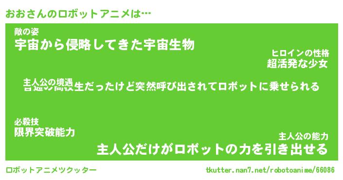 おおさんのロボットアニメは… 主人公の境遇『普通の高校生だったけど突然呼び出されてロボットに乗せられる』敵の姿『宇宙から侵略してきた宇宙生物』主人公の能力『主人公だけがロボットの力を引き出せる』 ツクッター #ロボットアニメツクッター http://tkutter.nan7.net/robotoanime/66086/