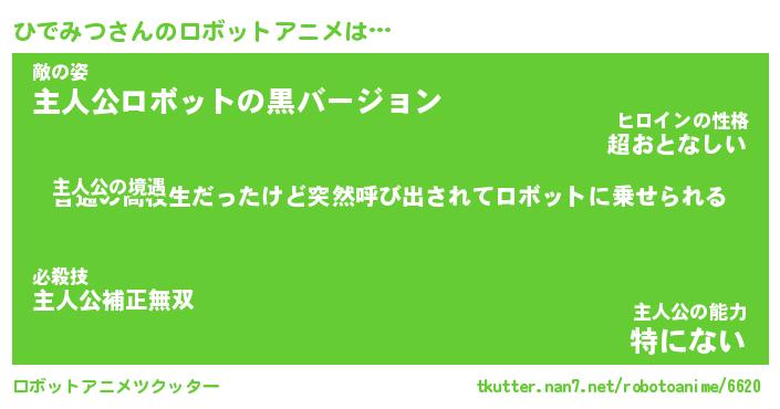 ひでみつさんのロボットアニメは… 主人公の境遇『普通の高校生だったけど突然呼び出されてロボットに乗せられる』敵の姿『主人公ロボットの黒バージョン』主人公の能力『特にない』 ツクッター #ロボットアニメツクッター http://tkutter.nan7.net/robotoanime/6620/